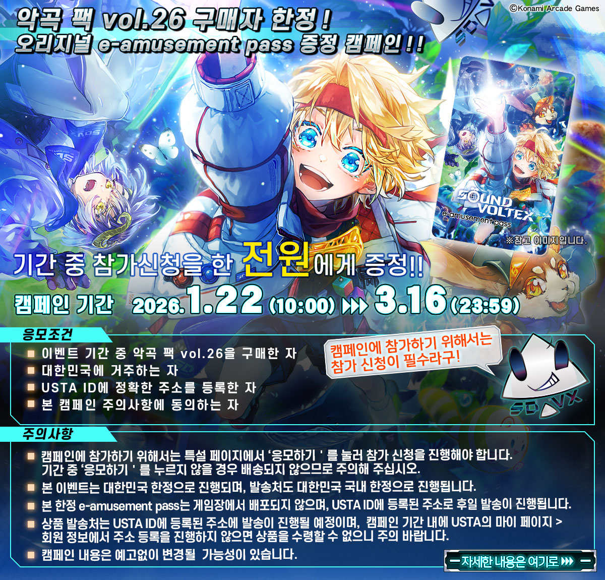 >(* o`▽o)〆” 내일, 1월 22일부터 USTA SOUND VOLTEX 악곡 팩 vol.26가 판매 개시!